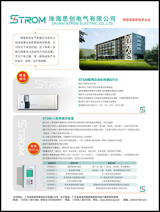2012年珠海思创电气有限公司(STROM)推出多个系列多种产品,已经推出的新产品包括:ST280系列全功能型保护测控装置、ST308分界开关控制器(看门狗)、ST320配网自动化终端(DTU)。